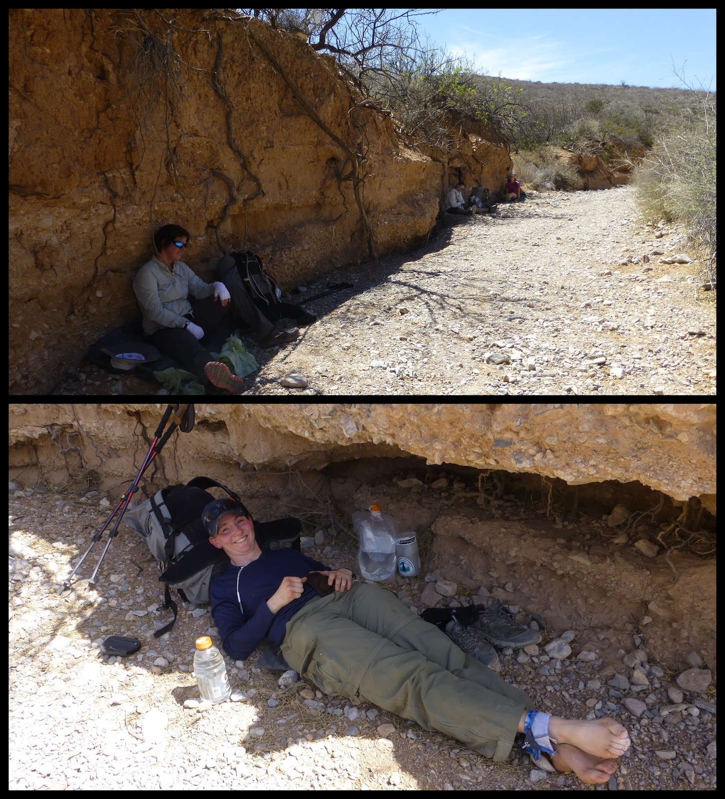 You can see we got some wisps of clouds that helped at the end of the day. There was very little shade and we found this spot along the trail in a drainage wash and relaxed for an hour.