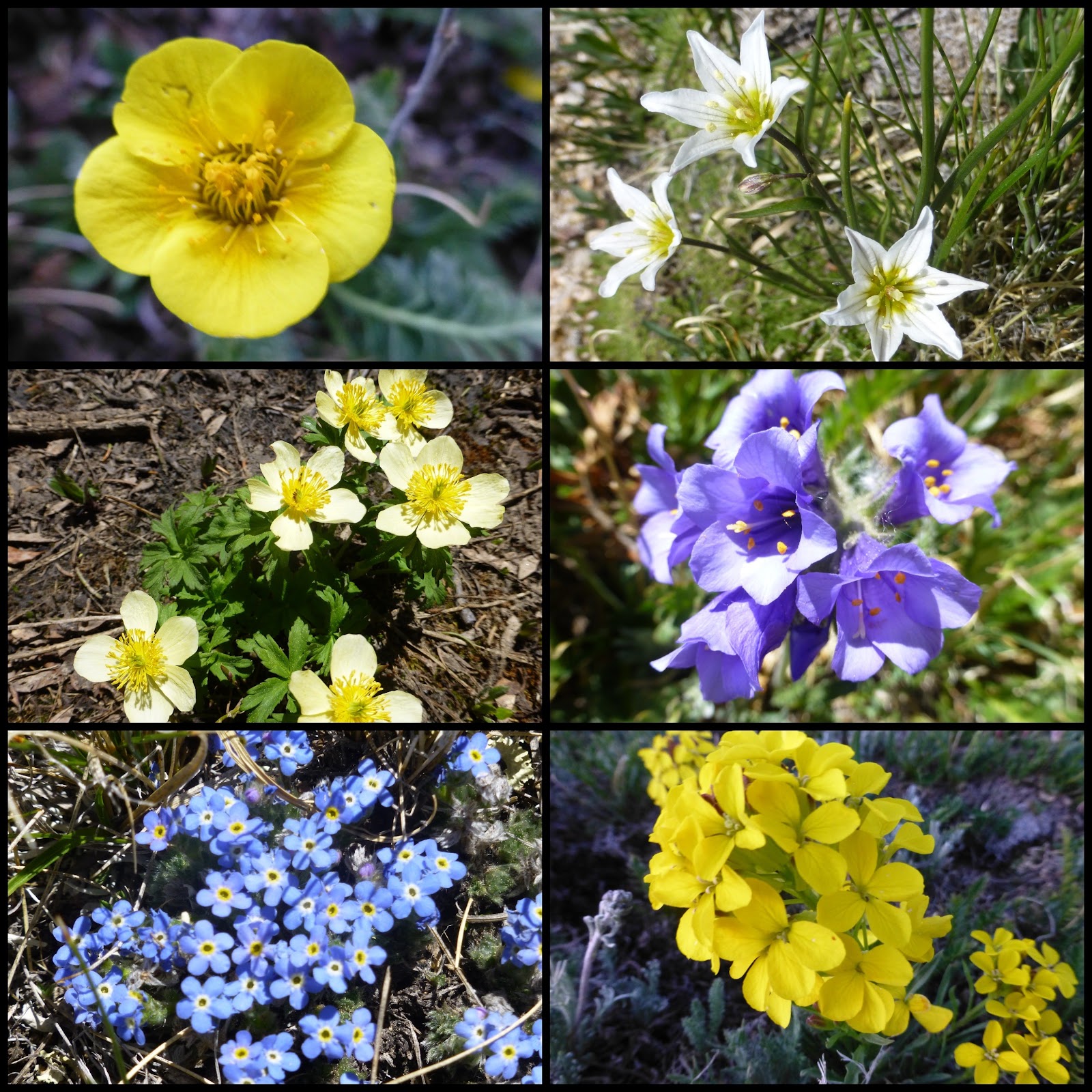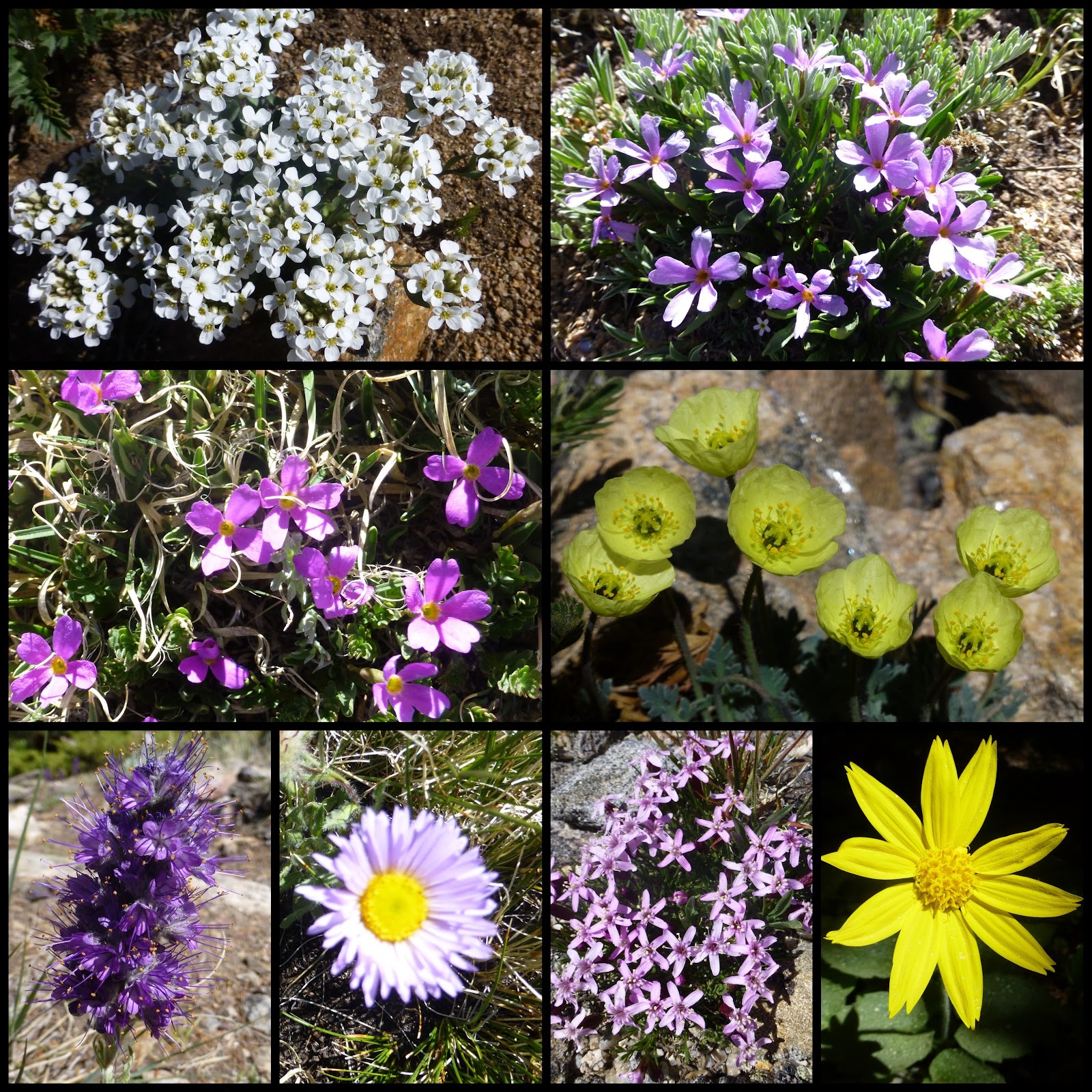 Mtn Rat texted me and seemed to have saved 2hrs of hiking so he is well ahead of me now. The route I took (and so did Track & Field) dropped 3,000ft and then climbed back up 3,200ft. It was the hottest it’s been in awhile when it dropped and it was tiring. The rocks just made it worse. The good news is that there are now a ton of different little wildflowers along the trail, so I had lots of cheerleaders in them today as they waved in the wind. I decided to take a picture of most of them and make some flower collages. It’s just amazing to me how many different flowers there are!
