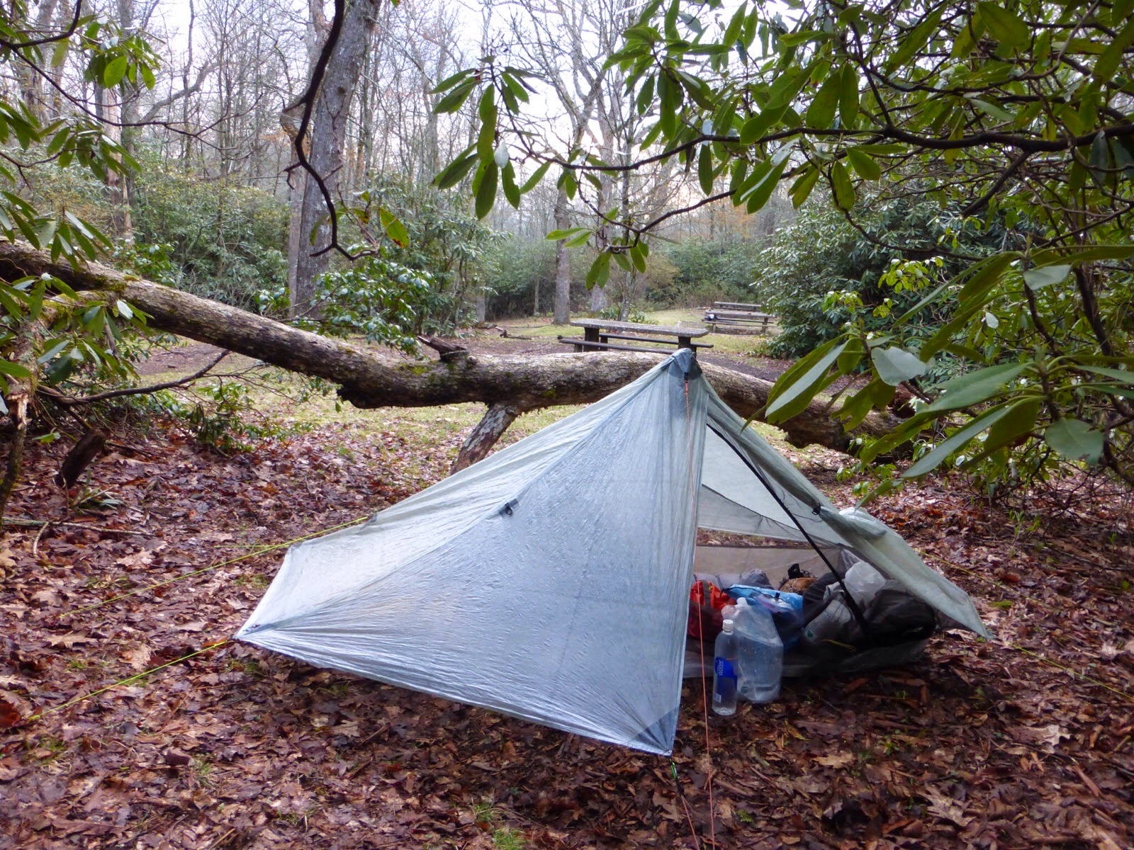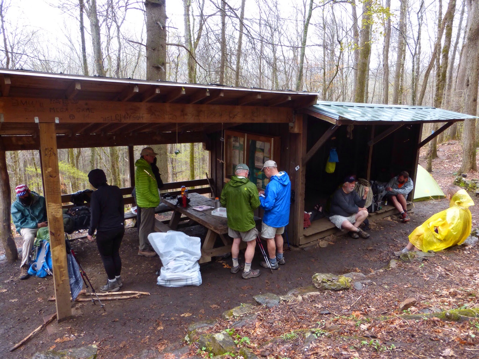 Much of the rest of today was a gentle downhill cruise. There were some climbs, but they didn’t last long and returned to the gentle downhill. It sprinkled or lightly rained most of the day, so I took less photos. I stopped for a late lunch at shelter so I could eat protected from the rain. One of the local outfitters gave some hikers a big box of Krispy Kreme donuts to give to all the hikers at the trail. It was a nice surprise, but also very odd to see something so commercial like a big box of Krispy Kremes in the woods. This shelter is the first time I’ve felt really claustrophobic. Lots were there and stopped for the day already and many were coming in for a break as the rain got a bit harder.