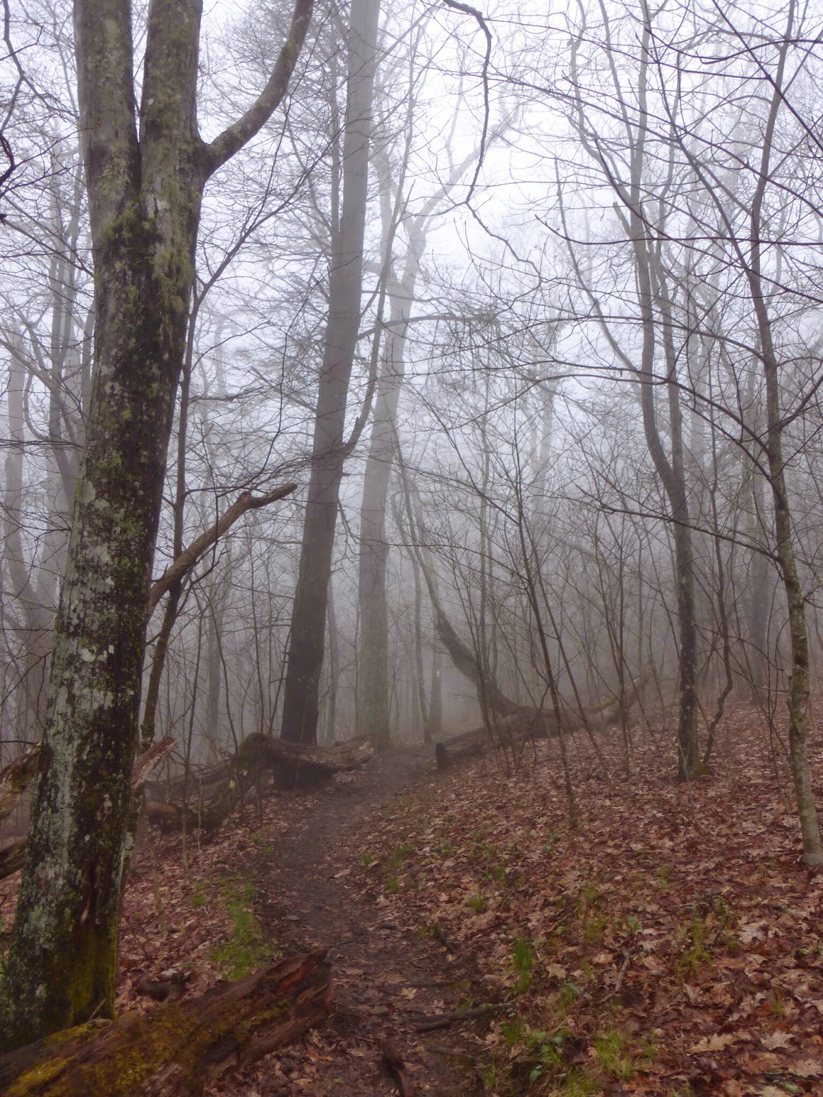 I hadn’t met any if them other than Beer Hunter and Timber who arrived as I was finishing my lunch. We ended up hiking the next hour together to a road where BH & T were going into town to resupply. There many choices of town stops along the AT so people are always going on and off. I continued my final climb of the day of 1,200ft over Siler Bald. Thankfully the rain stopped as I climbed and I was able to hike in my tshirt and shorts. As I got higher though, I hiked into the fog that had been hovering overhead. This is how it looked up top and as I hiked down.