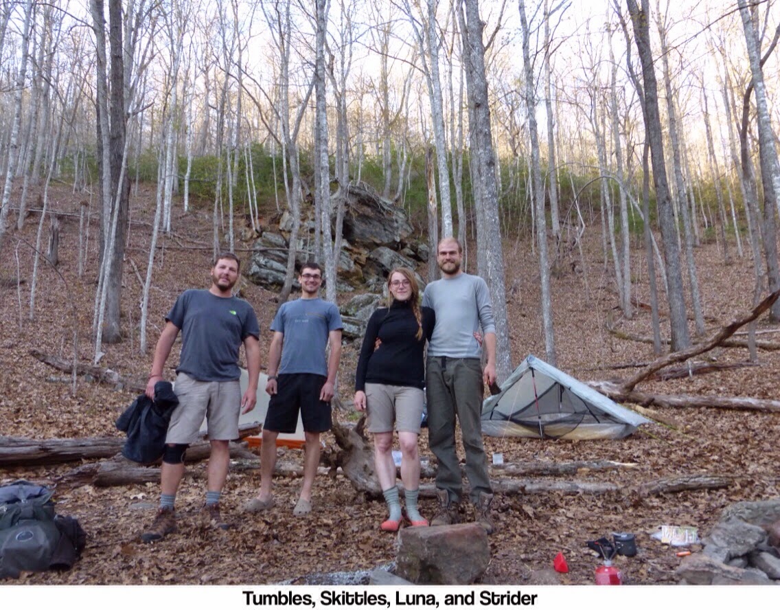 I hiked up the steep hill to camp and headed for a spring where I’d get final water for the day and hike a bit further to camp. When I got there, two other thru hikers were camped there and said I could join them. I told them I was going to go a bit further to keep a schedule for the next day. They said that if I was aiming for 25mi to Fonatana Dam tomorrow, I could hike with them because they were too. These are the first hikers (since Harly on Day 1) I met planning to do over 20mi. I was still tempted to hike on to get more of the steep climb out of the way, but I told myself I’d do what I could to embrace the people side of this trail. They are very nice and sold me when they said they aren’t loud and wanted to go to bed early to get an early start tomorrow. Their names are Skittles and Tumbles and they have been out one day longer than me, so they’ve also been keeping a good pace. Another couple joined us shortly after that I had talked to my first night. They are doing pieces of the trail and hitched up to do this part. Here is everyone and our site which isn’t the flattest, but quite picturesque.