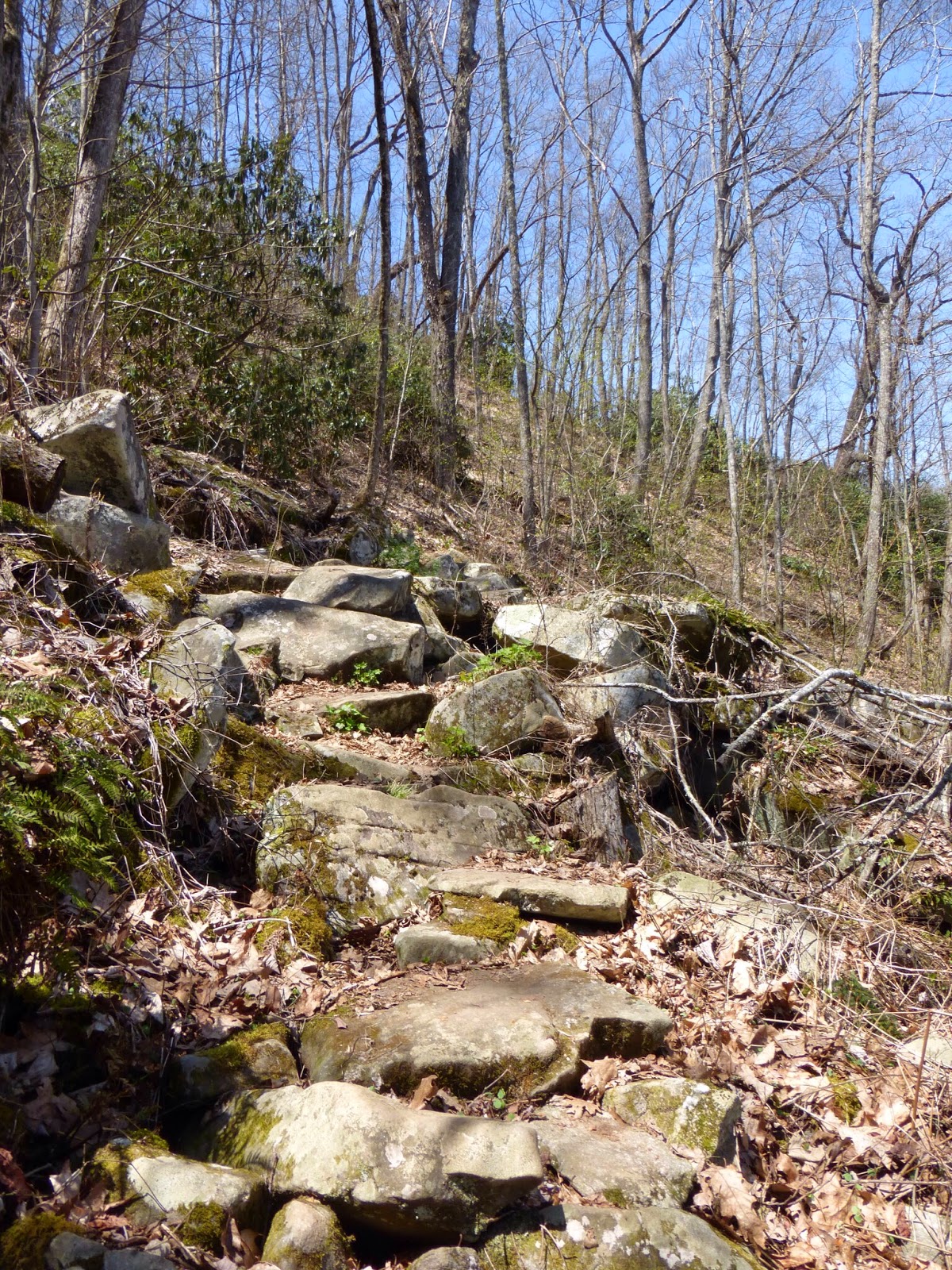 So I have to say that I was quite bored today. These days happen from time to time and I know it’s temporary. I think it was the change from all the views yesterday and the fact that tomorrow I’ll be entering the Smokies! The morning went by quick, but by the time I finished lunch, I was over it. I don’t know if it was my visions of the lodge or just that I’m tired of seeing the same thing all day…dried leaves and bare trees. I tried to distract myself in many ways. I finished the audiobook, “The Fault in Our Stars.” It was sad, but I was still glad I listened to it. I’d rotate radio, mp3 player, and listening to the sounds of the trail until I walked up on someone and I’d talk to them briefly. After lunch, I decided I needed something more to distract me, so I focused on all the flowers popping up through the dead leaves. I took pictures of each and that was fun. Feel free to identify them for me!