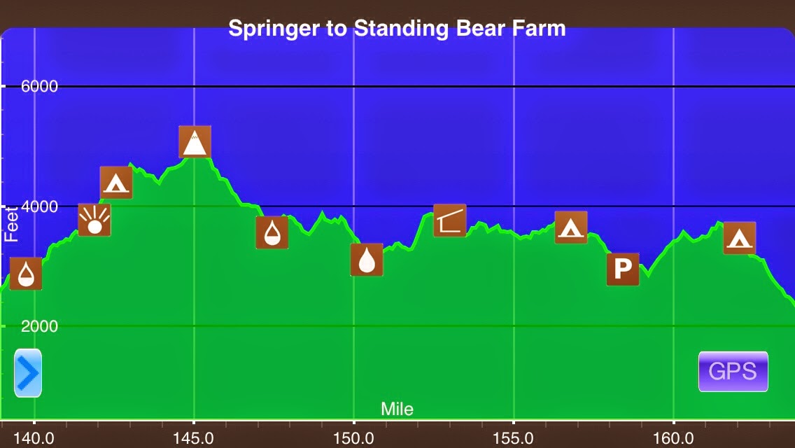 This morning was the first morning that I set my alarm on this trip. I set it for 5:45am, packed up in the dark, and was hiking by 6:30am as the sun was rising. I knew today had a lot of ups and downs and I wanted get started early to make it 25mi so I could end the day at the Fontana Dam Lodge. Skittles was still in his tent and Tumbles was packing up when I left. His goal was to make it to the lodge to split the room with me if he could. Nothing can express the steepness of some of the climbs today, but I want to try. Here is a snapshot of what I hiked today from the app I use called Guthook’s AT Hiker App. I mentioned it in more detail in my preparation posts, but he has apps for the PCT, CDT, and AT and it’s great to have.
