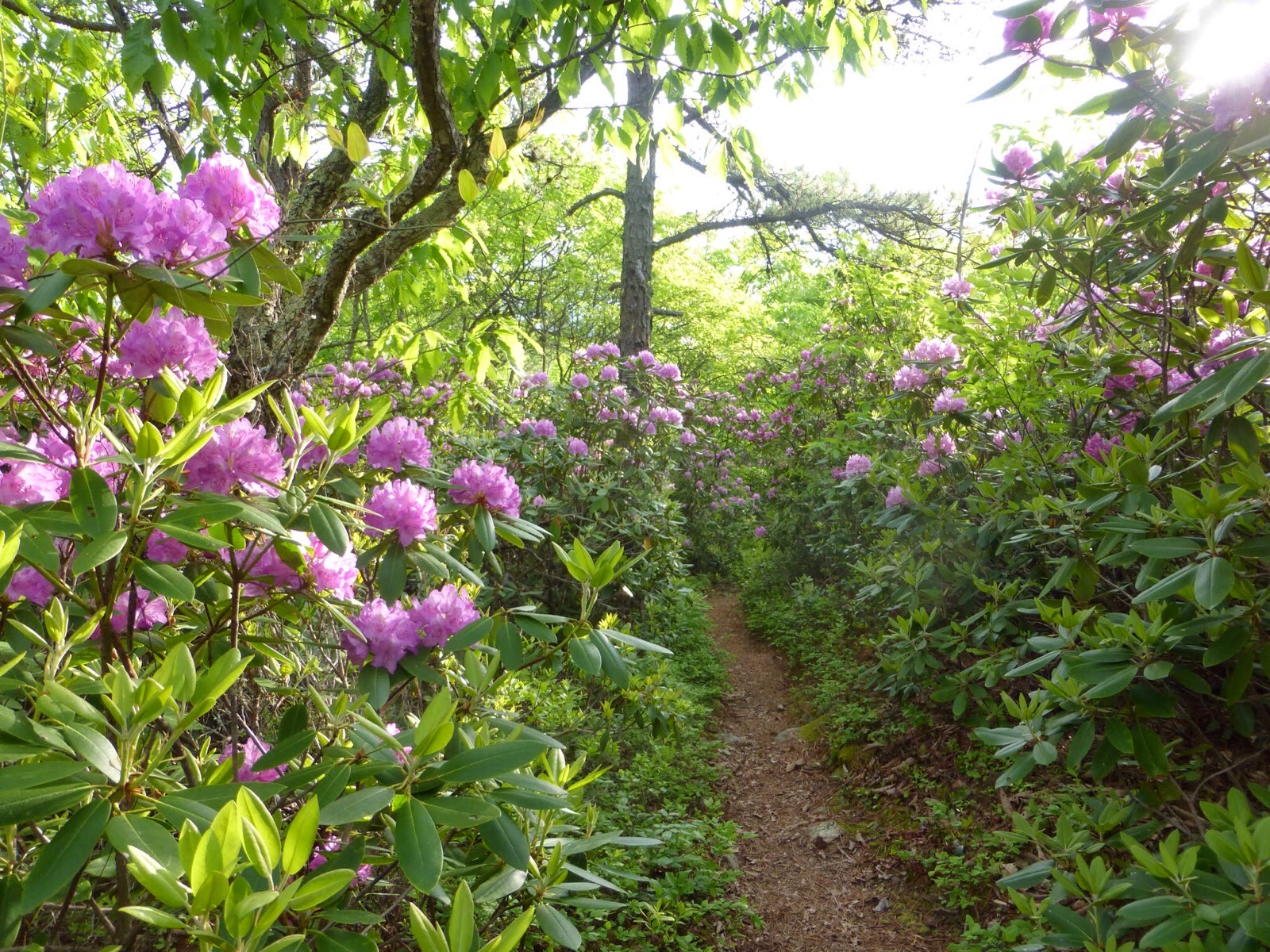 It did end up raining last night around 11pm, but it was just a shower. It sounded wonderful, but the trees were enough to catch it as hardly anything hit the tent and I was able to keep my doors open with just the mesh exposed with not problem. I didn’t sleep well because there were deer walking around in the leaves down the hill from my tent on and off all night. It had to be deer the way they were moving, but it was so silent outside that it sounded like something much bigger. Also, it was the first night that I’d say it was hot and humid. I wore as little as I could and was sticking to my sleeping pad and couldn’t decide if I wanted the comfort of the sleeping bag or not. I got up and was hiking by 6:45am. It was a leisurely hike today as I only needed to do 10mi to get to where I was going to be picked up to go to town. The rhododendrons are in full bloom and it’s really magical to walk through them and also have their petals covering the trail below.
