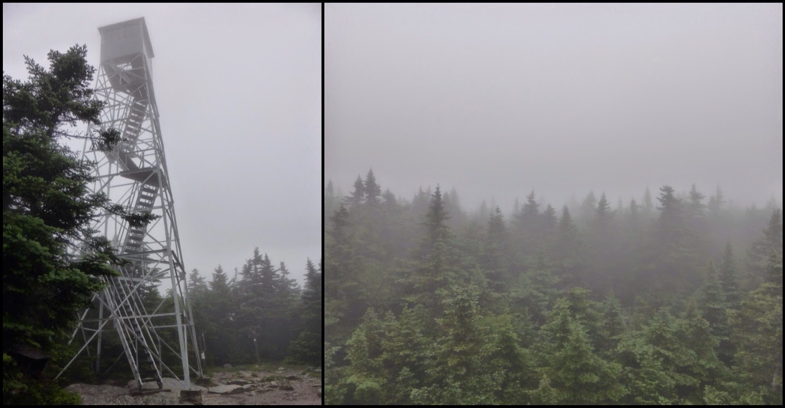 I am sooo thankful for the umbrella! I was completely dry today except for my feet and any brush that hung over the trail. There was one long gradual climb that I actually enjoyed because it kept me warm. It was over Stratton Mtn, which is apparently where Benton MacKaye was inspired to propose the creation of the AT…well, I don’t think he was there on a foggy rainy day…here is what I saw. It was quite gusty, so I climbed partially up the tower to get the “view.” Bummer I missed this view.