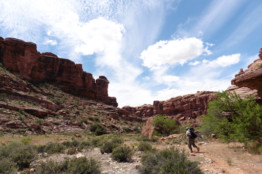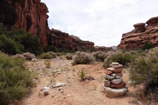 The frustrating part on her end was that she did that route to not be in the Hayduke herd and needing some solitude, but now she’s right in the middle again with Wyoming, Freebird, and the brothers right behind us. With us slowing and her exiting her route early, it’s just a poor coincidence and not much we can do about it. She stayed at the water and we hiked on through Hack Canyon. It was a really nice canyon! It is an actual trail and had many large cairns leading the way as the trail went up out of the wash as it zig zagged over it. There was more sand, which helped my feet and some rocky parts still mixed in.