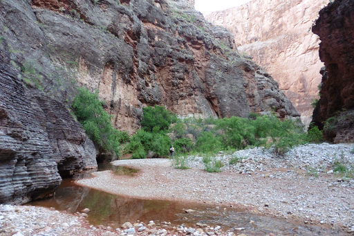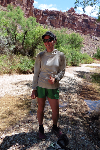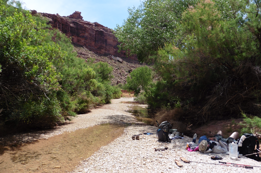 As we packed up to leave, I saw Katherine hiking up on the game trail and called over to her to make sure she saw the water. We knew she was about an hour from us from rafters that saw her yesterday and expected to see her today, but had yet to hear how the alternate she took, called “Three Days of Terror” went and how she was already here. Good news is that she’s all ok and safe. She did 1.5 days of terror and decided to exit back to the route we were on given the conditions of water, pack weight, and safety. She gave it a good go and so did the guys a couple weeks ahead of us and all exited at the same point. It sounded like the name was justified. Good to know she’s okay. Her pants are as torn up as Gavin’s, so she’s sporting the shorts.