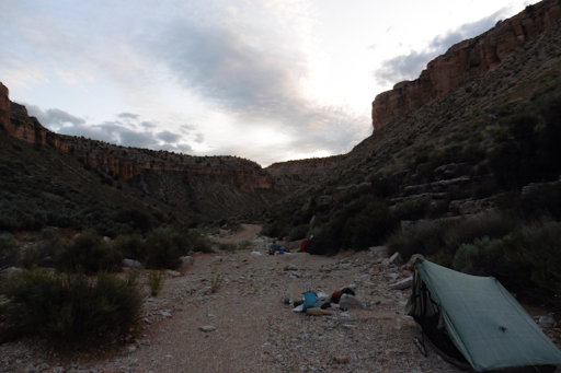 We are camped in a gravel wash and it’s surprisingly cooler. Great for sleeping. We are setup perfectly to hit the water source for lunch tomorrow. Hope my feet like the roads better tomorrow. Good to be off them now…