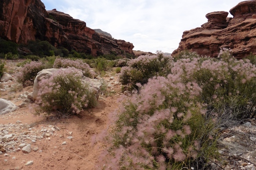 Kanab did dry out as we hiked up and we knew water would be intermittent up canyon, but it was a gamble when to grab for the long haul of dry for 20-30mi to come. I was frustrated with my feet pain and chose to risk it and didn’t get water from camp, like Gavin did. I passed the early streams that were now clear after the clay mud had a chance to settle overnight. I was convinced more sources would come and they did…but they were filled with clay mud again. I started to ration, kicking myself for playing the water roulette game. We turned into Hack Canyon and it was even drier with a wash and then higher game trails to keep you up out of the wash. Soon into the canyon, I noticed brush and trees down in the wash and got hope…It was getting hot now that the days of clouds finally cleared and I saw a shadow under the tree in the wash…then I noticed it wasn’t a shadow, it was water! We weren’t sure if it would last and be further up the wash, so we bushwhacked down and had lunch at our last source for 20mi. We took an extra long break and I made my dinner there knowing I wouldn’t have water to cook tonight.