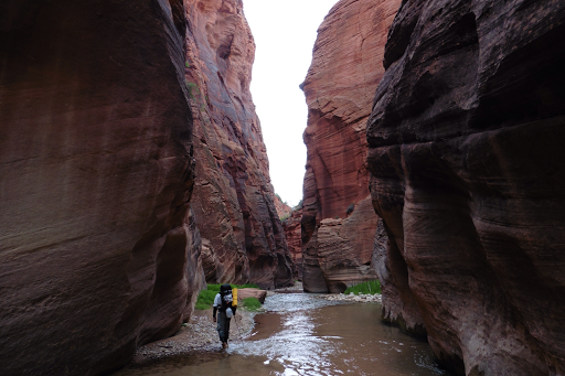 After the river walking, we climbed up a steep crack called “Fat Man’s Misery” to get out of the canyon. The camera was put away as it required full attention and hands, but I’m kicking myself for not getting a shot. It was fun and felt like the Hayduke’s final obstacle, but was not safe by most standards as I was carrying 5L(10lbs) of water and many moves required climbing straight up and sometimes slightly overhanging. Only on the Hayduke, would a climb like that one…steep, thin, exposed, loose large/small rocks, scrambling, brushy, covered in poison ivy…be considered normal. At least I’m off trail in two more days if I get poison ivy. With it being the last few days, we are noticing things like our last time wading in cold