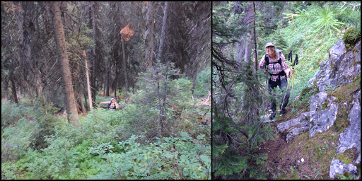 Thinking that was the worst of it, we continued on into the forest expecting to find game trail like we did on the way up…Nope! There was nothing and nothing felt “right.” It was a bit disorienting in the forest and we just kept trying to head down figuring that was the way to go…Nope! We kept hitting cliff bands that we couldn’t get down and had to either hike back up thick brush or contour around to find ways down. This was definitely not a path many take!