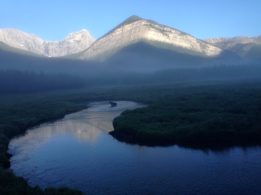 E was in front and stopped suddenly. She saw a figure far in the distance through the fog and thought it might be an animal. It was! It was our first moose of the trip! It put on a show for us and walked around and through the creek. Really awesome way to start the day!