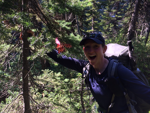 After that sighting, we headed downhill to find another large cliff band dead end. Each time this happened, it was a time consuming scramble through brush to work our way over or up and try again where it would appear to be clear. We inched down layer by layer hoping it was leading to a way down that wasn’t an impassible cliff. The guidebook mentioned ribbons marking the way at some point, but that could be 20yrs old and so much was downed trees, that we doubted they existed. It was getting later and was 5:45pm when we were bordering on completely resetting and hiking all the way back up to start over again. I tried something that felt clear for a few yards and came to a steep down stopping yet again. We really were stumped at a loss of where to go. E suddenly got excited and told me to look up next to my head….it was a pink ribbon! A miracle to run into this tiny thing seriously randomly!