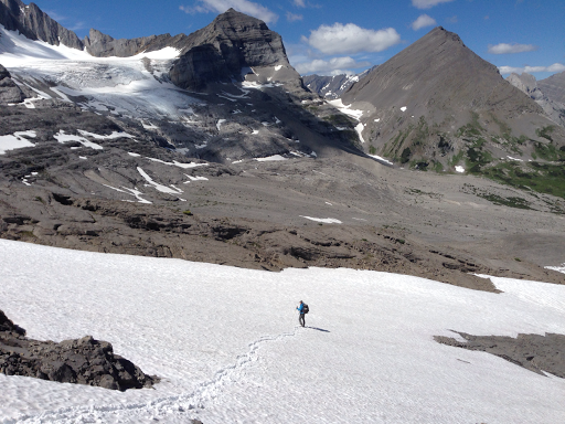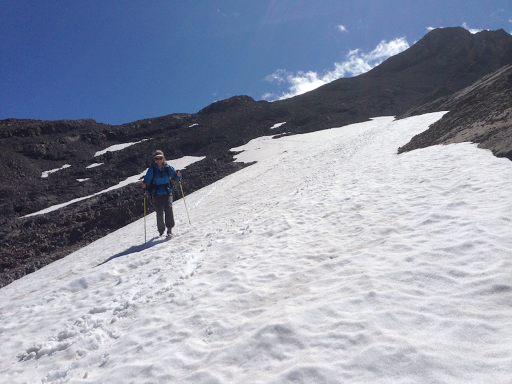 Our lunch was glorious and we took our time soaking it up. The 360 degree view as stellar and well worth the effort and time it took to get there. The pass is just to the east of these mountains and behind us as we ate lunch. Compared to our center stage view of those glaciated mountains, the pass seemed so so, but it was cool. We easily climbed up some scree and got to see the view of what we’d be going down.