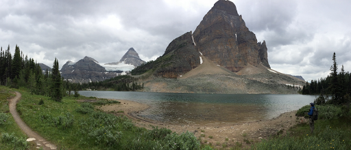 Today is said to be one of the highlights of the whole trail. The trail goes right by a very popular destination in Mt Assiniboine Provincial Park. To really take it in, we decided to schedule a short day to camp there and then spend the rest of the time day hiking side trails. The morning started off at our regular 6:30am start time. Again, rain/storms were forecasted for 60% chance. The first couple hours of the morning, it rained lightly here and there. We did a short alternate that parallels the GDT to take us over Wonder Pass rather than the wooded Assiniboine Pass. It’s a bigger climb, but has more of the alpine views. We started off along Marvel Lake with plenty of wildflowers and mountain views as we hiked up. We even heard and saw a rock avalanche come down across the lake on a mountain side. Second time this trip. So surreal to see.