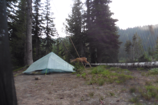 Once again, the two of us were up throughout the night with the brightness of the moon…and also the deer that walked around the campsite for what seemed like the whole night. Here is a shot of one of them from my tent this morning as it went by E’s tent for the zillionth time.
