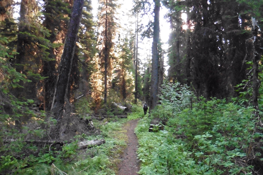 While I was packing up this morning, I reached to the bottom of my pack to grab my trash compactor bag to put my tent in since it had condensation this morning and nothing was there. I forgot to put a new one in my pack after I used the old one for my poison oak clothes on the Lost Coast Trail. It better not rain in the next few days…We got going by 6:30am and had four miles of gradual downhill. It started out in a burn section and we wondered if it was the burn from 2013 that closed this stretch for us that year. It was relaxing hiking on down, but not especially scenic as it got quite dense and brushy until lunch. To pass the time, I listened to an episode of a fun new podcast I mentioned two days ago called Mystery Show.