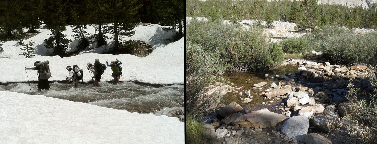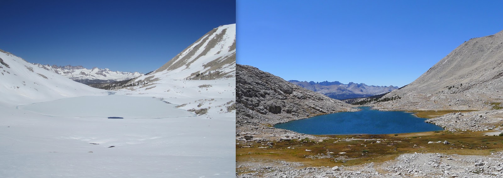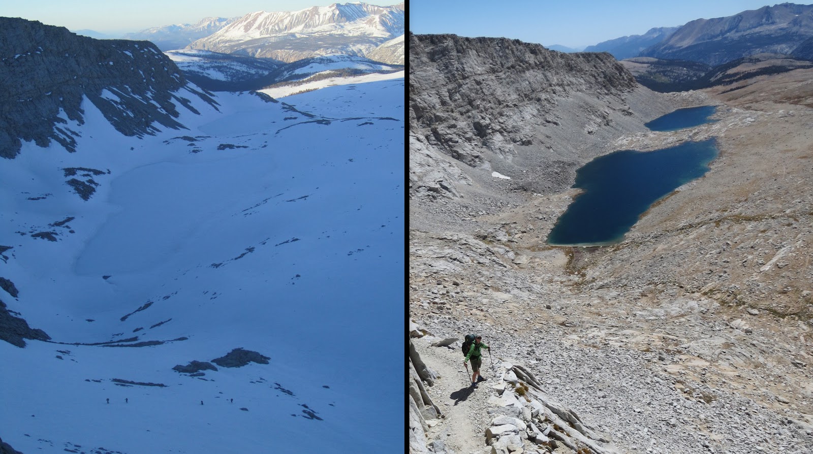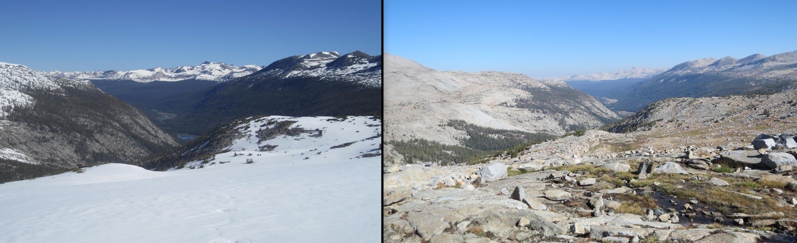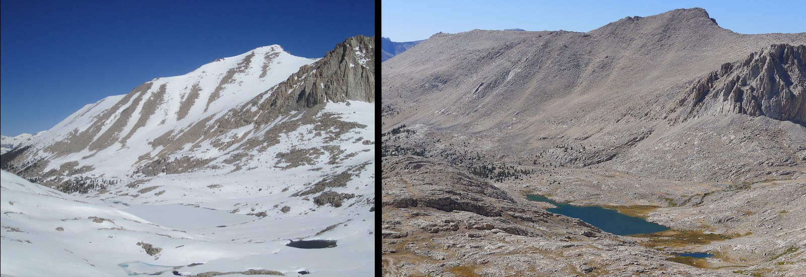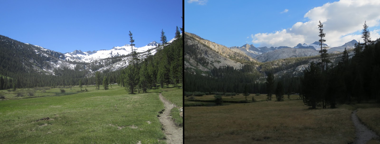 These comparisons are incredible! We're hiking this year 2013 (ihearttrail.wordpress.com), and hope it looks more like the pictures on the right…ice axes are still causing me anxiety 🙂 But tell me, how were the mosquitos without all the snow around?