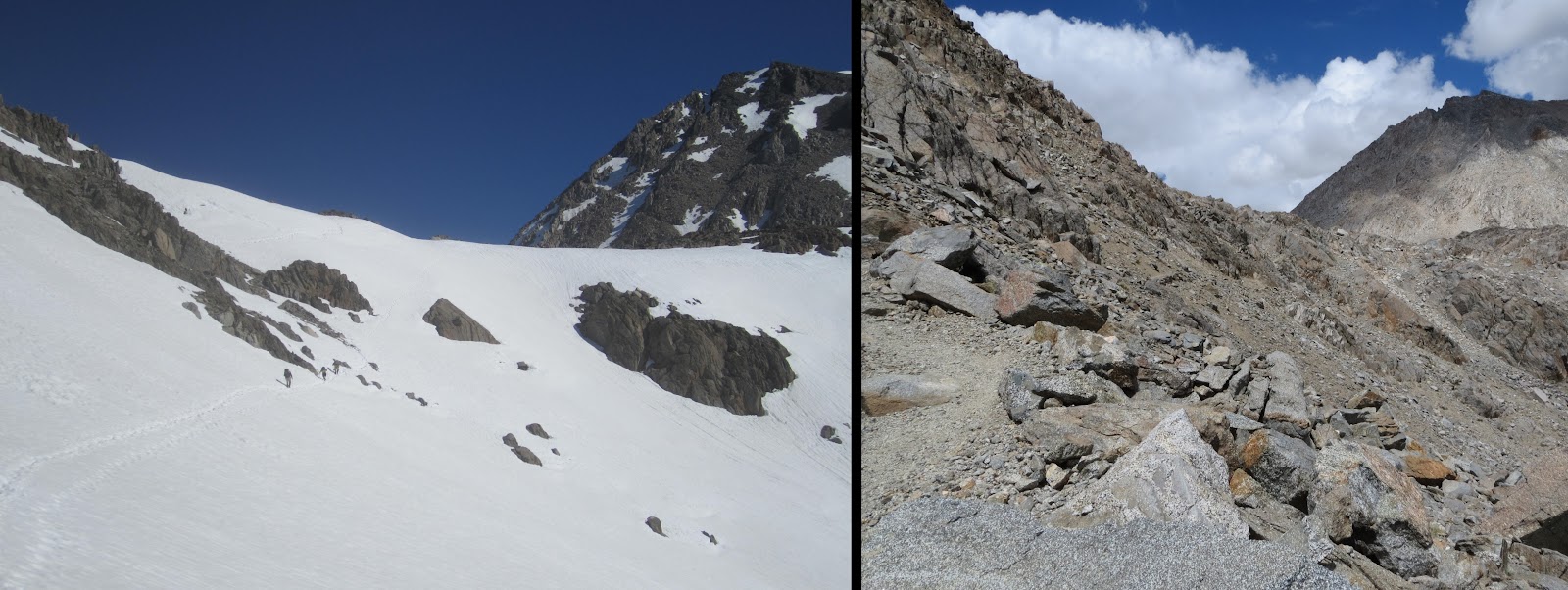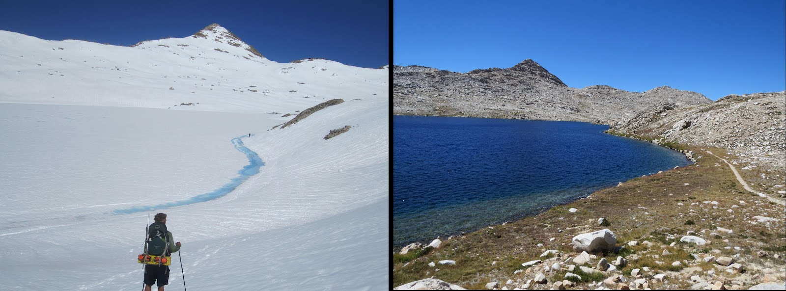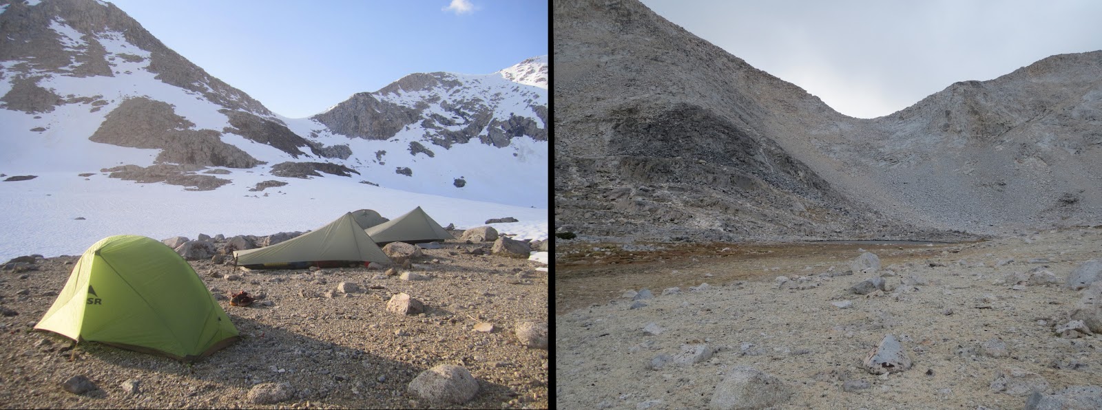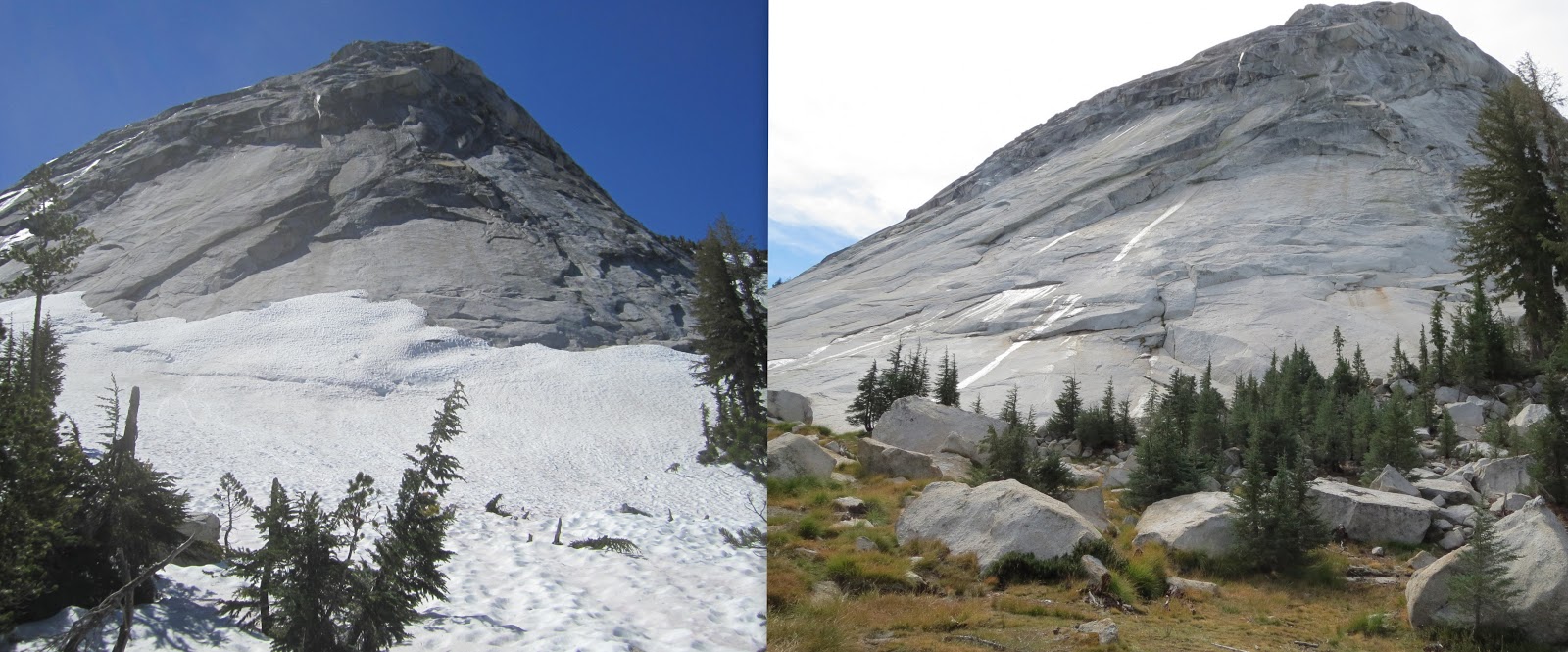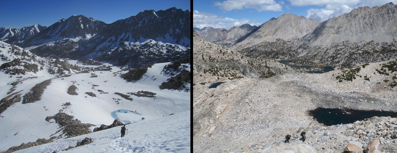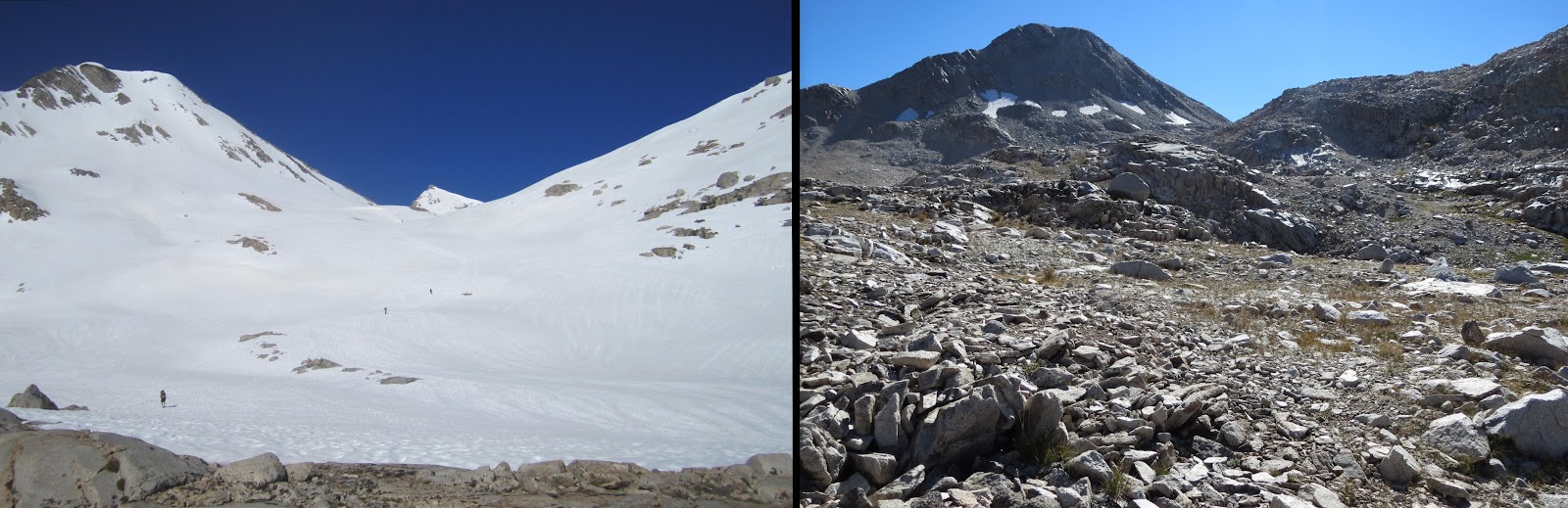 These comparisons are incredible! We're hiking this year 2013 (ihearttrail.wordpress.com), and hope it looks more like the pictures on the right…ice axes are still causing me anxiety 🙂 But tell me, how were the mosquitos without all the snow around?