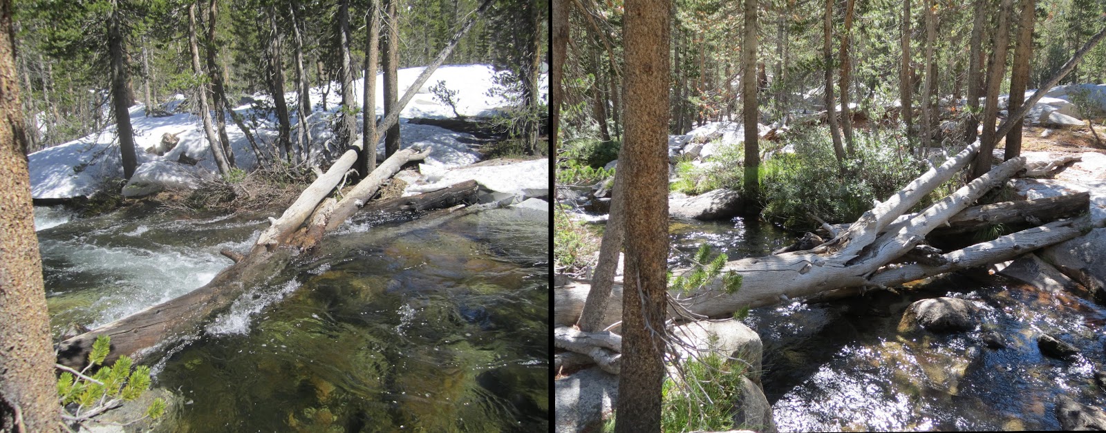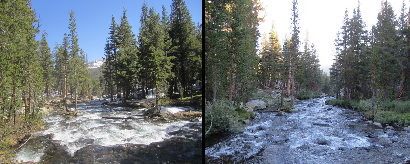 | Lyell Fork from the footbridge below Donahue Pass. Notice the snow and deeper rapids last year. |