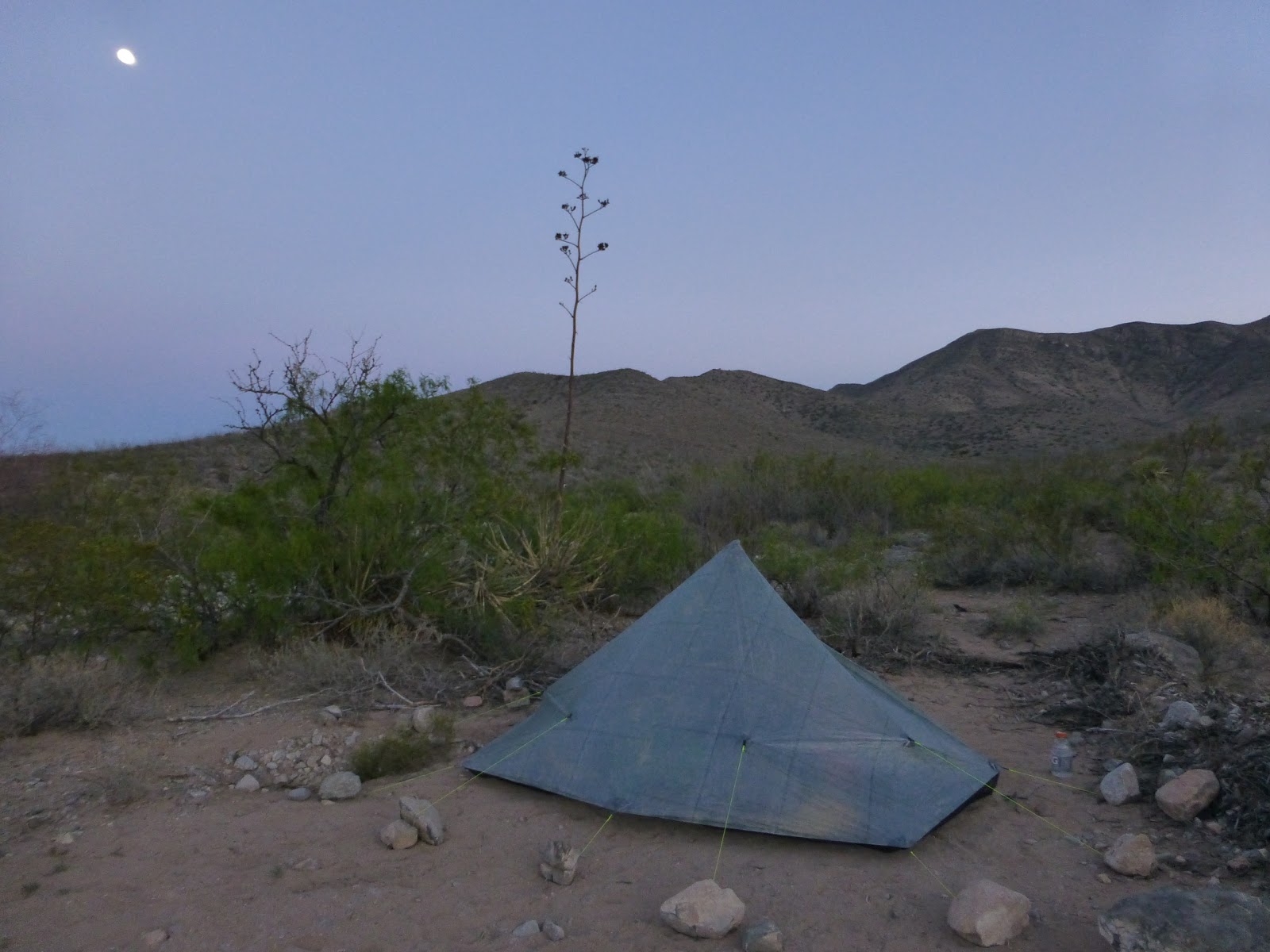 We got to camp early around 5:30pm, which was great! I’m rusty and need the extra time to set up camp and blog. This is only the third night I’ve set up my new ZPacks Hexamid Solo and the setup is definitely going to take some practice. I was pretty frustrated with it tonight. The wind was blowing and I was in a very dusty area with rocks, so the stakes weren’t going in easily. This is not a free standing tent. My hiking pole props it up from the inside and then it is staked out on the sides with up to ten stakes to keep it taut. I think it took me three tries and about 40mins to get it up right…then the wind stopped…of course! I was really missing my Tarptent Contrail, but I know I’ll figure it out with practice. Everything is covered in a layer of dirt and it’s in all our noses making it difficult to breathe. Ah, the fun of the desert. Here is my setup tonight. It is almost a full moon and I don’t even need my headlamp with how translucent this tent is. The tall plant behind the tent is a Yucca. You can see I have rocks on the stakes in case the wind picks back up overnight.