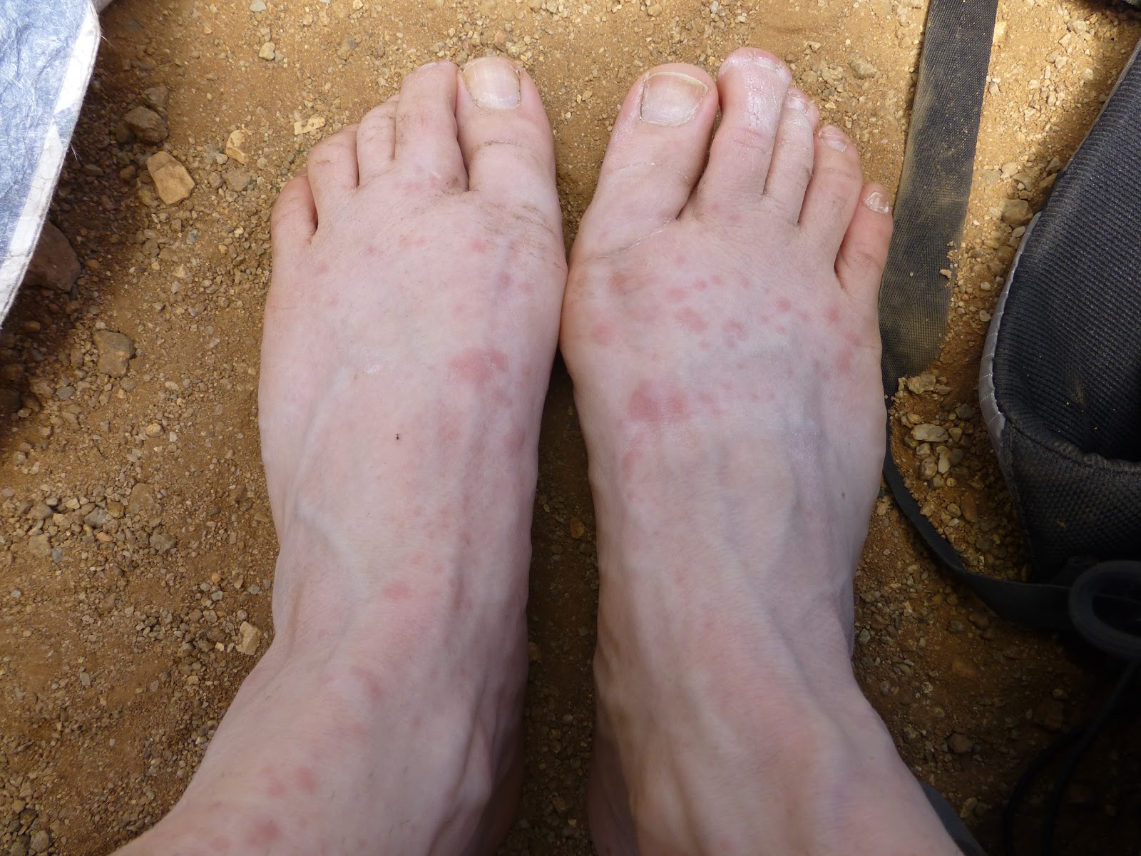 I’m just not a big fan of this desert strategy for me. The extended break still has me lying in heat so it wears me out. Plus, it’s really difficult for me to stop my momentum and get back up after such a long break. The other problem is that we used this strategy today without getting up extra early (started hiking at 7am), so it just made for a shorter day. It was in the 70s in the morning and upper 80s to mid 90s during the break. It was definitely difficult for me to take the break, but I am outnumbered on this one and trying to accept it. The girls know I’d rather keep hiking and just get to camp earlier or take mini breaks. They have agreed to try to leave earlier at 6:30am tomorrow. I usually do 6am, so this is a good compromise. I know this is temporary for the desert, so I’m trying to just accept it. Plus, our bodies need the shorter days to adjust to hiking again and prevent injury. We all already have some soreness and/or blisters, which will be pretty common the first couple of weeks as our bodies get back into thru hiking. Personally, my ankles hurt from rolling on this terrain, but that will pass. Also, I got my first blister on a toe today. Finally, my heat rash that I get on my feet in the desert didn’t take long to start up. So far it isn’t bad, so maybe I’ll get lucky. Here is a fun foot shot of my wonderful heat rash.