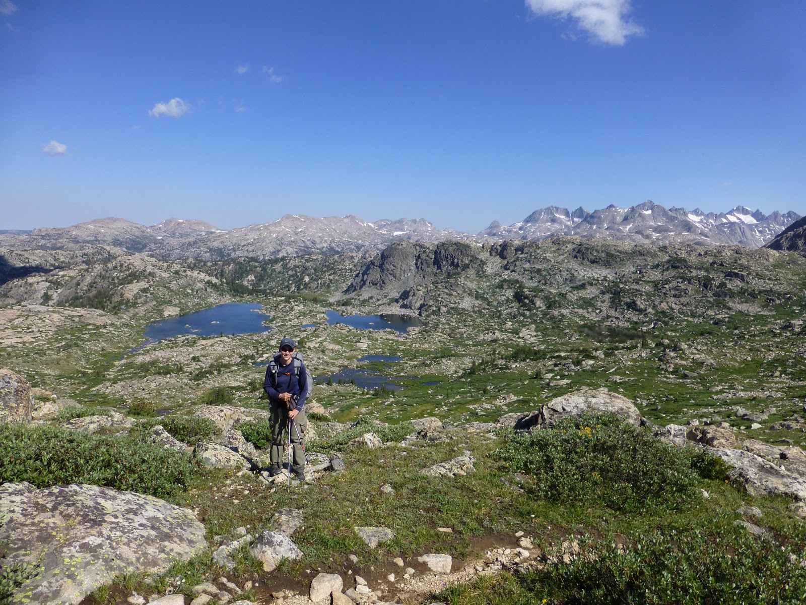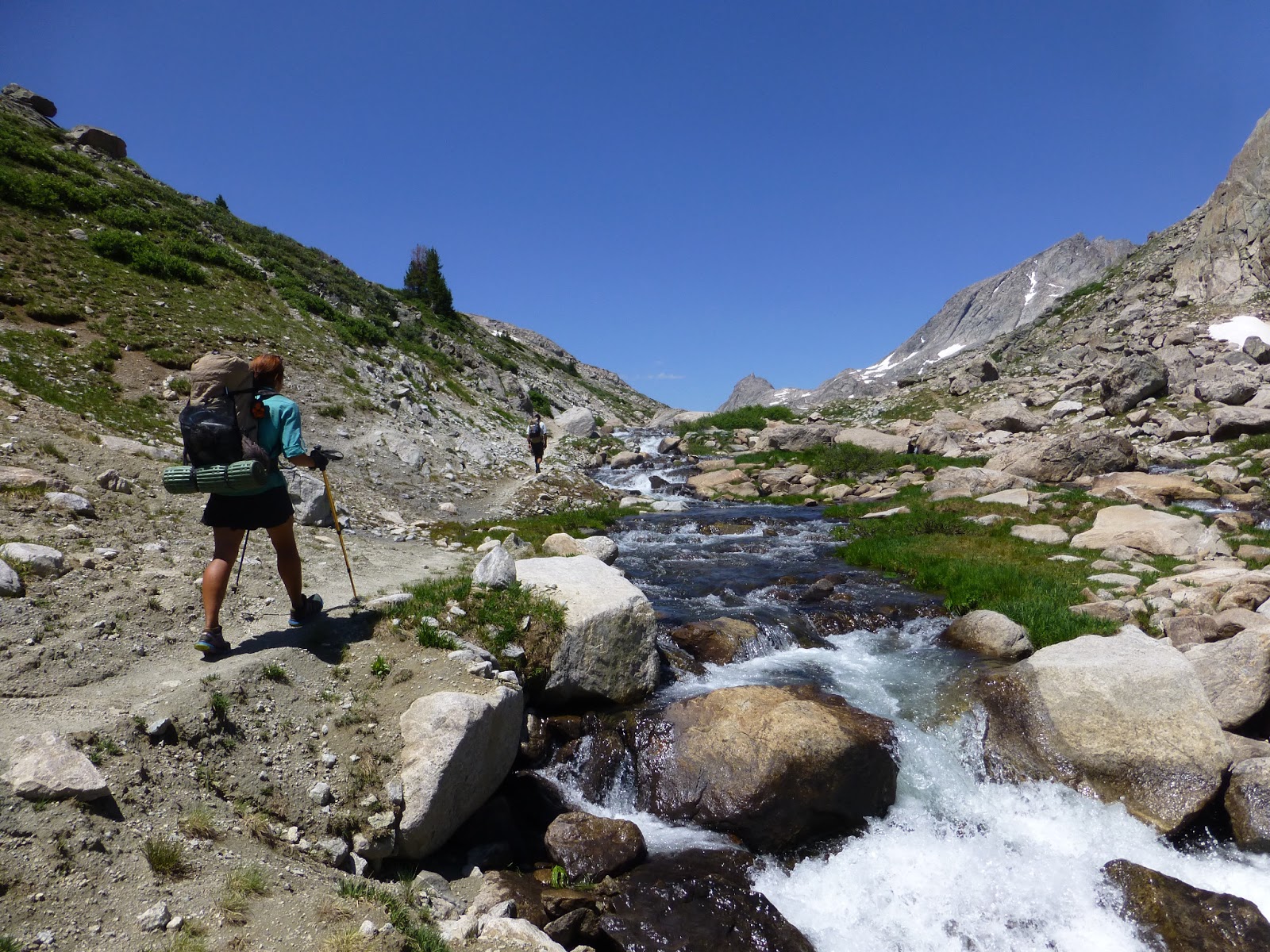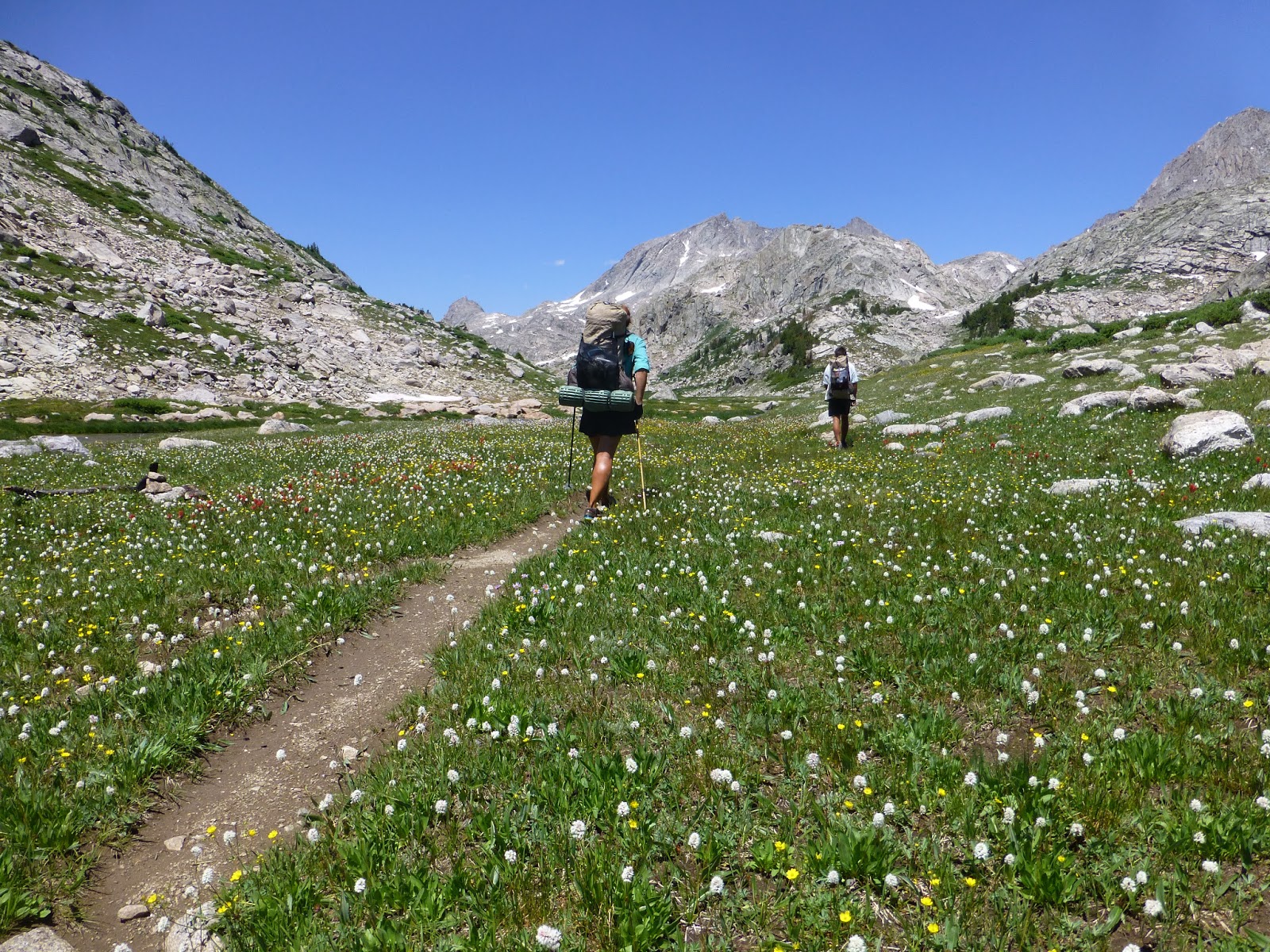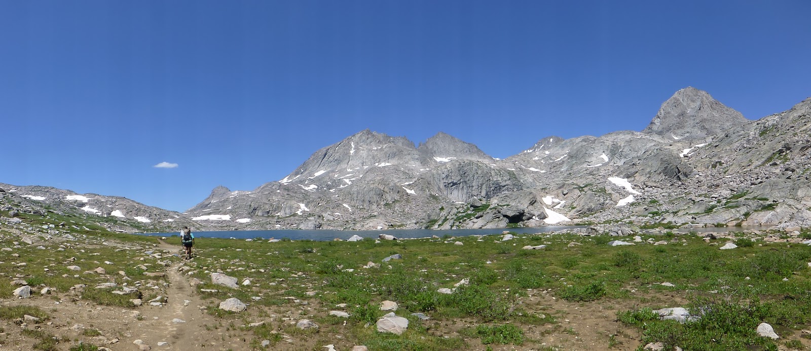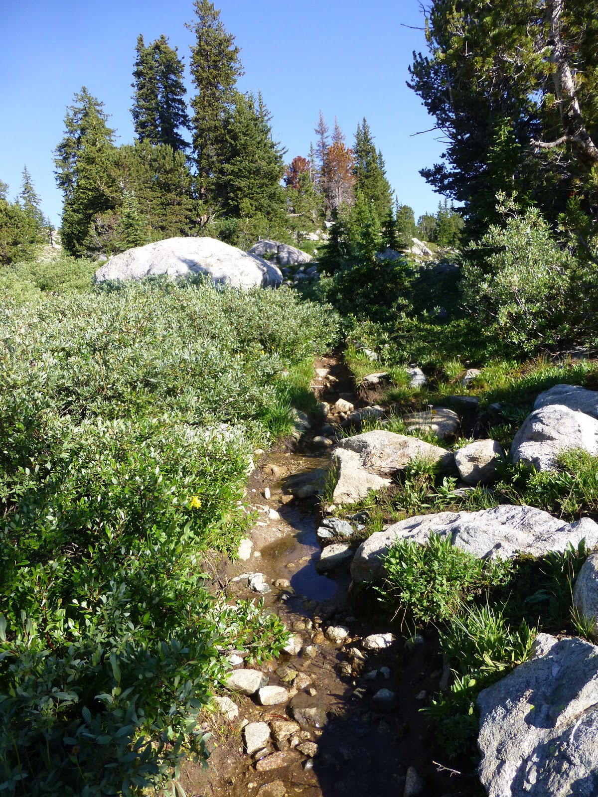 We had an option today to do an alternate called Titcomb Basin/Knapsack Col and decided not to do it. I’m not sure how many hikers take that route, but it looked like something way out of my and Rampage’s comfort zone. It involved going over a very time consuming boulder field and some exposed areas with steep scree…um, no thank you. Hikers I followed last year say it is some of the most spectacular hiking/scrambling they have ever done, but also used the words exhausting and terrifying in their descriptions. No death wish here and I know where my comfort zone is, so I’m sorry for those of you hoping to see that alternate. Rockin’ is 3-4 days behind me and may do that alternate as she loves that stuff, so I recommend checking her journal for it possibly.