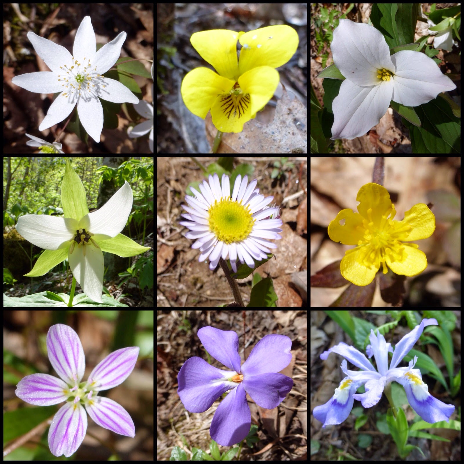 Having grown up on the AT, I recognize your flowers and they remind me of home. L to R, top to bottom: Bloodroot, Yellow Violet, Large-flowered Trillium, Trout Lily, likely an Erigeron, a Cinquefoil, probably Dwarf at this time of year, a Spring Beauty, either Carolina or regular, Birdsfoot Violet, and Dwarf Crested Iris. Beautiful. Makes me homesick for my AT.