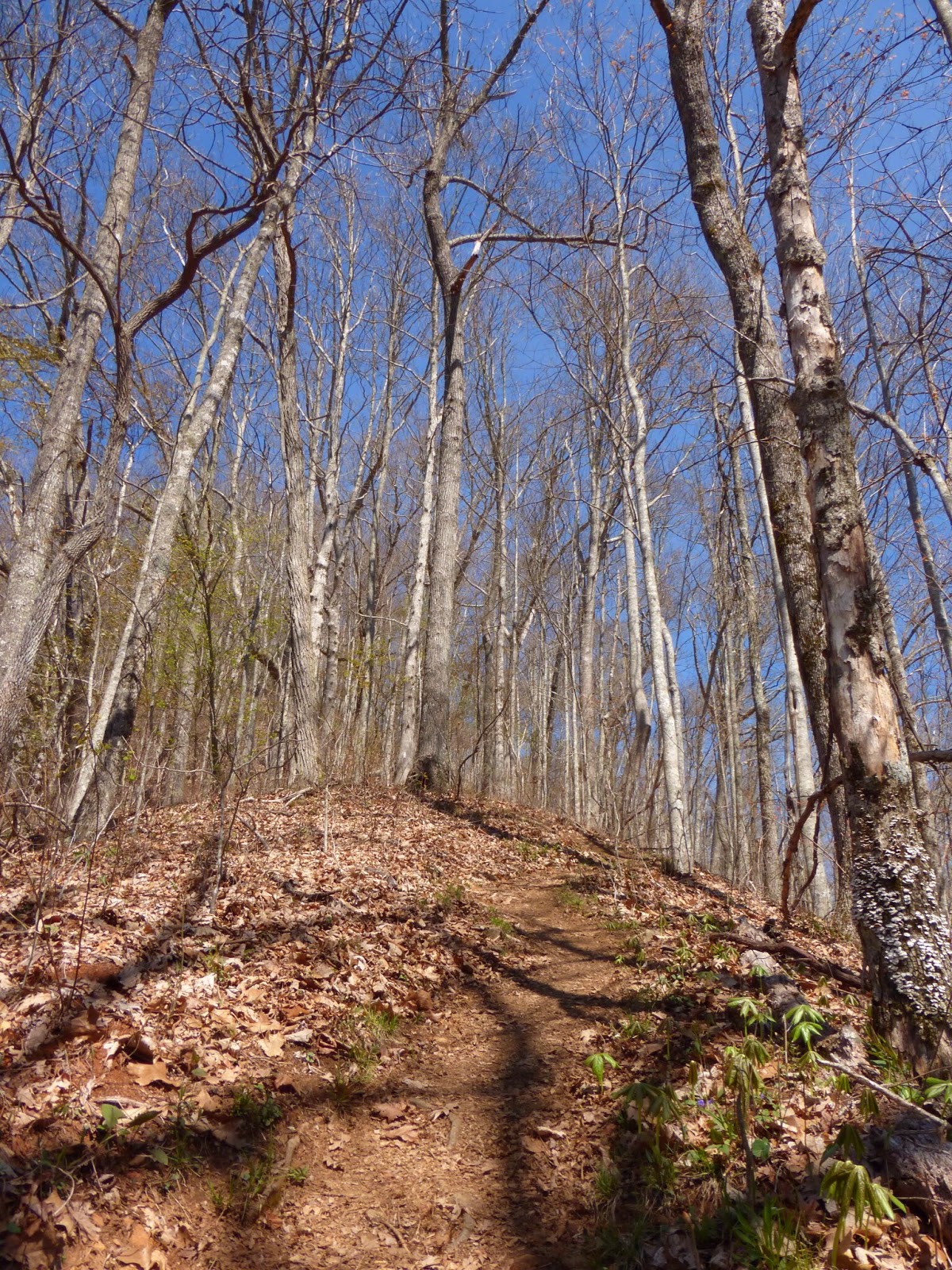 So I have to say that I was quite bored today. These days happen from time to time and I know it’s temporary. I think it was the change from all the views yesterday and the fact that tomorrow I’ll be entering the Smokies! The morning went by quick, but by the time I finished lunch, I was over it. I don’t know if it was my visions of the lodge or just that I’m tired of seeing the same thing all day…dried leaves and bare trees. I tried to distract myself in many ways. I finished the audiobook, “The Fault in Our Stars.” It was sad, but I was still glad I listened to it. I’d rotate radio, mp3 player, and listening to the sounds of the trail until I walked up on someone and I’d talk to them briefly. After lunch, I decided I needed something more to distract me, so I focused on all the flowers popping up through the dead leaves. I took pictures of each and that was fun. Feel free to identify them for me!