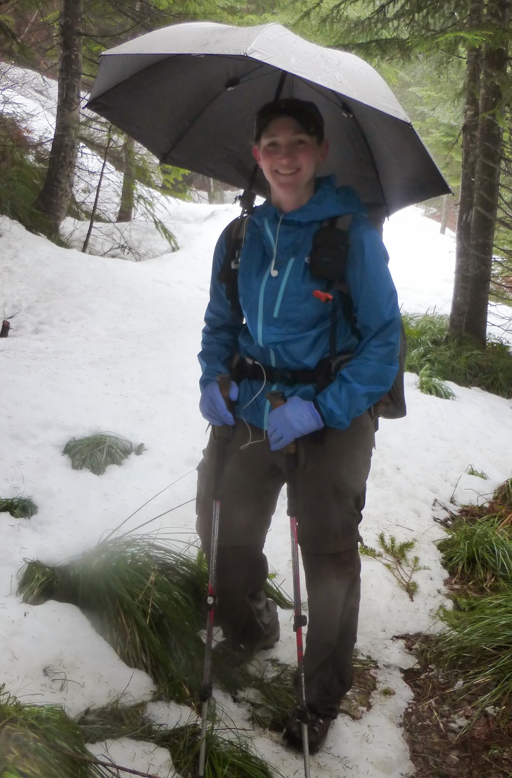 I also carried a light rain jacket, OR Helium, rain pants. and blue latex gloves to go over my gloves. The rain pants may have been overkill, but for me they were worth carrying for the few times I used them, mainly early in the hike. Some did use ponchos, just a rain jacket, or nothing at all. Just know you will get wet with all these options so it’s how comfortable you are with being wet and how much protection do you want. In addition, I used a trash compactor bag as an inner liner in my pack and it kept everything completely dry. Yes, the pack was wet, but it dried quickly and will usually get wet anyway with a pack cover.
