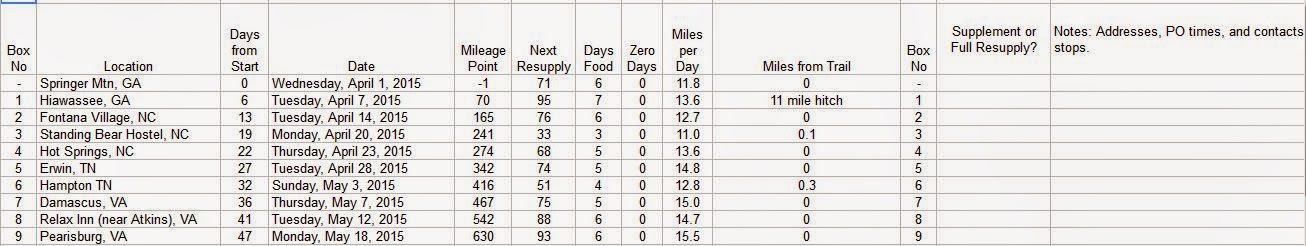 I’ve made a master copy that can be shared. Just click on this link and it will bring it up in Google Drive. You don’t need a login. You can then save your own copy and rename it so that you can make your own doc and edit it as you please adding/removing towns. I think most towns are listed on the master, but I’m sure some might be missing. If you prefer excel, just download it under the “file” tab when it comes up. I found it to be helpful to keep it in my Google Drive as it automatically synced with my resupply person, anyone I shared it with, and the embedded chart I had on my blog. For planners, it’s a piece of GOLD. THANK YOU to Peanut Eater for sharing it!