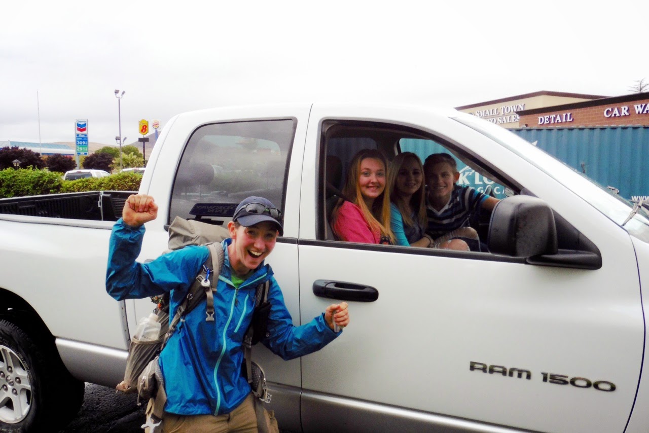After 1mi of hiking and trying to hitch on the very fast highway, a white truck pulled over! Three teenagers kindly let us lie in the back of the truck and it was a cold ride with the incoming storm. We were so happy to be heading to town. They were on their way to see Pitch Perfect two and I badly wanted to go too! Thanks for the ride you guys!