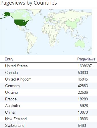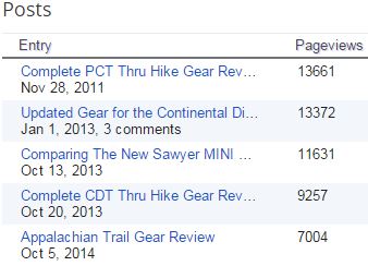 Here is a shot of the pageviews over time. I like to see how it spikes during a hike and how it shows the height during the AT last summer. The “humps” from left to right are the PCT, CDT, AT, and then this summer with the Hayduke. Again, these are physical hits on the blog and don’t include those that read directly from the email subscription.