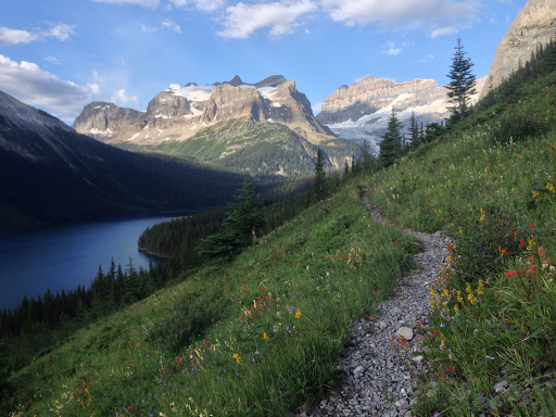 Today is said to be one of the highlights of the whole trail. The trail goes right by a very popular destination in Mt Assiniboine Provincial Park. To really take it in, we decided to schedule a short day to camp there and then spend the rest of the time day hiking side trails. The morning started off at our regular 6:30am start time. Again, rain/storms were forecasted for 60% chance. The first couple hours of the morning, it rained lightly here and there. We did a short alternate that parallels the GDT to take us over Wonder Pass rather than the wooded Assiniboine Pass. It’s a bigger climb, but has more of the alpine views. We started off along Marvel Lake with plenty of wildflowers and mountain views as we hiked up. We even heard and saw a rock avalanche come down across the lake on a mountain side. Second time this trip. So surreal to see.