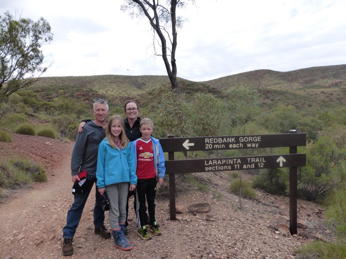 By the time we got to the trailhead and ready to go, it was 2pm. The temps thankfully warmed just enough to not be brisk in the wind at 59F/15C There is a short side hike to see the gorge that I had hoped to do with the Ginbens-Johnsons, but I was worried about having enough time to hike the first section of the Larapinta (to the top of Sonder Mtn and back) before dark, so we parted ways where our paths split. I’ll check out the gorge tomorrow morning. THANK YOU to the Gibbens-Johnson family and don’t forget to to check out their travels on their blog as well.