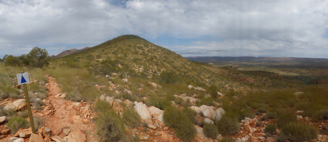 I quickly went over to the camping area and pitched my tent so I could throw most of my things in there and then head up to do Sonder Mtn. Similar to the John Muir Trail and Appalachian Trail, the western terminus of the Larapinta is up on the lookout of a mountain. It is a 9.4mi/15.1km round trip to the viewpoint and back to camp with 2329ft/710m of gain to get there. Both the guidebook and local signs give generous estimates on how long it would take. I had just under 5hrs before dark and figured I could make it, but that it might be close depending on terrain.