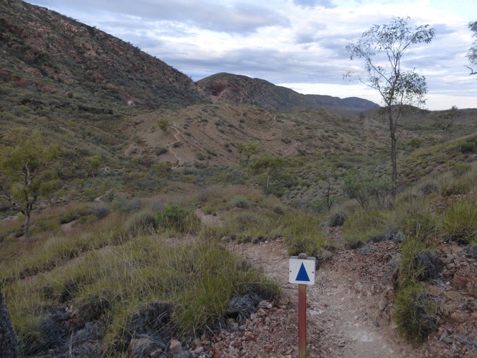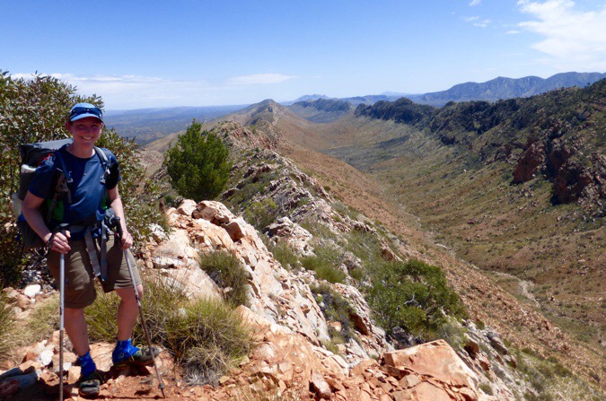 I met a pair of guys going my direction that I leapfrogged with in the middle of the day. There was another one of those 3G phone signs up on the main viewpoint today. I love those signs! I took an extended lunch up there and was able to get yesterday’s post up. While up there, I did the half mile side trip along the ridge to Counts Point. There was also a tour group that had hiked up that are doing sections of the Larapinta as day hikes with a guide. I was able to get a photo taken at Counts Point and that was nice. That is not the ridge I hiked up on, but it’s a cool view that shows how far I’ve come. The silhouetted mountain far in the distance is Mt Sonder where I started.