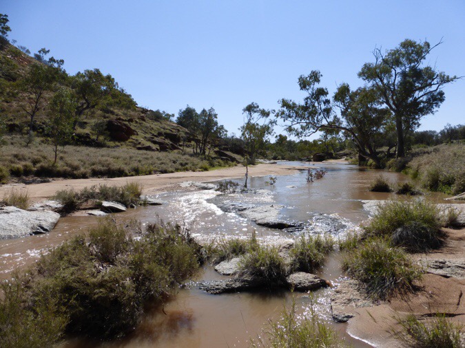 Then it was a solid hour or so following an actual creek! Because of the hard rain last night, all the dry creek beds were actually full of water and actually running water at points. It says in the guidebook that the water clears quickly, so I wonder if it all drains within a day. There was plenty of it, but it was all quite brown from the sand and it made for really slow hiking to find ways around the water. The path generally is the dry creek bed, so anything that strays from that is either rock outcrops, tall grass, or pointy Spinifex. With smooth rocks and wet sand stuck to the bottom of my shoes, it was cautious rock hopping. It was very slow going.