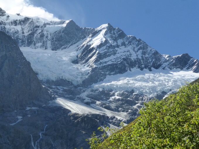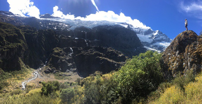 We were dropped off at the point where the road changes from pavement to gravel, so it was perfect to grab a car slowing down. After less than 5mins, a woman named Michelle stopped to give us a ride the rest of the way. Michelle is going on her first solo trip in decades, and it was inspiring to see her going for it while her husband and teenage kids are all otherwise occupied.We started off from the Raspberry Creek trailhead at 2pm. It’s 2-3hrs walk to our destination at the Aspiring Hut, along the West Matukituki River. Along the way is a side trail that goes out and back 2.5mi/4km each way to see Rob Roy Glacier. We made it up in about an hour, and it was totally worth the side trip. Pictures don’t do something this grand justice at all.