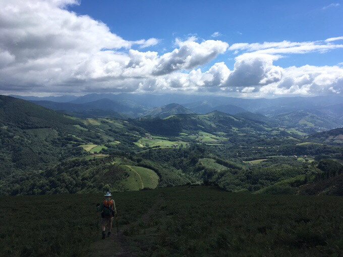 We did this until reaching lunch at Col d’Ibardin. There was a ton of up and down today. If you’re looking for a flat stroll, this ain’t it. We had 4265ft/1300m of uphill and 3510ft/1070m of downhill, whew! As we hiked up, we had great views all day overlooking Hendaye and the Atlantic Ocean. There were also a ton of horses grazing. We haven’t figured out why there are so many, but they are everywhere in all colors, and sizes. Some even have have long hair.The terrain was the full spectrum including sidewalk, paved roads, dirt roads, grassy, trail, rocky, steep, gradual, and flat. The guidebook does not indicate mileage, and only notes how long it takes to get from one landmark to another. This is sensical given that we are going to be on a route that has varying terrain and pacing. From what previous hikers have done, this first day is about 18 miles. I thought about tracking this to have mileage, but then I decided to embrace it and it is actually quite nice to have a less concrete label to what I’m doing and just have a nice time estimate. The author, Tom Joosten, has given times that are quite good estimates for the type of hiker that would be looking to do a high route. Our times today were only just slightly faster if not right on the estimated times.